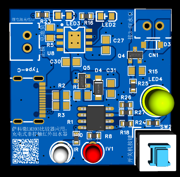 4.1圖一為薩科微運算放大器LM393比較器根據紅外對管感應進行高低電平的比較輸出。該裝置接有薩科微單節鋰電池管理芯片SL4056,通過單節鋰電池供電來驅動負載工作。Type-C給電池充電,充滿電的時候指示燈會熄滅,當手在紅外對管上面揮一下時候,會檢測到障礙物,比較輸出高電平來驅動水泵正常工作,按鍵SW2做開關按下去指示燈亮同時提供照明,該裝置廣泛應用于茶水間,自動上水的時候只需要手往紅外上面揮一揮就能自動加水,非常方便實用。