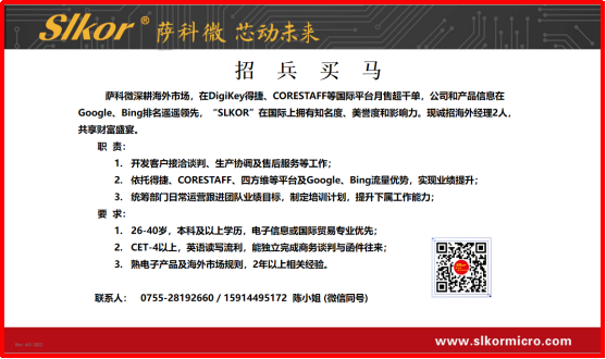 3、薩科微(m.zgthjj.com)和金航標為強化國際市場布局,現誠聘海外市場銷售部經理,要求具備電子元器件海外營銷經驗和英語溝通能力,助力品牌全球化發展。