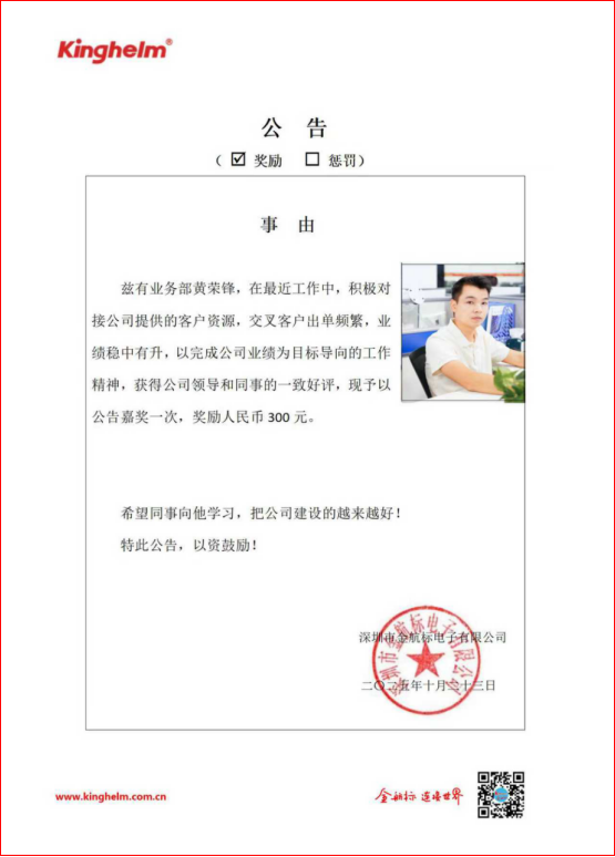 2025年10月20日到2024年10月25日,金航標(www.kinghelm.net)/薩科微(www.slkoric.com)“每周之星”經過同事們評比,這周“每周之星”是薩科微業務部黃榮鋒,在最近工作中,積極對接公司提供的客戶資源,交叉客戶出單頻繁,業績穩中有升,以完成公司業績為目標導向的工作精神,獲得公司領導和同事的一致好評,現予以公告嘉獎一次,獎勵人民幣300元。