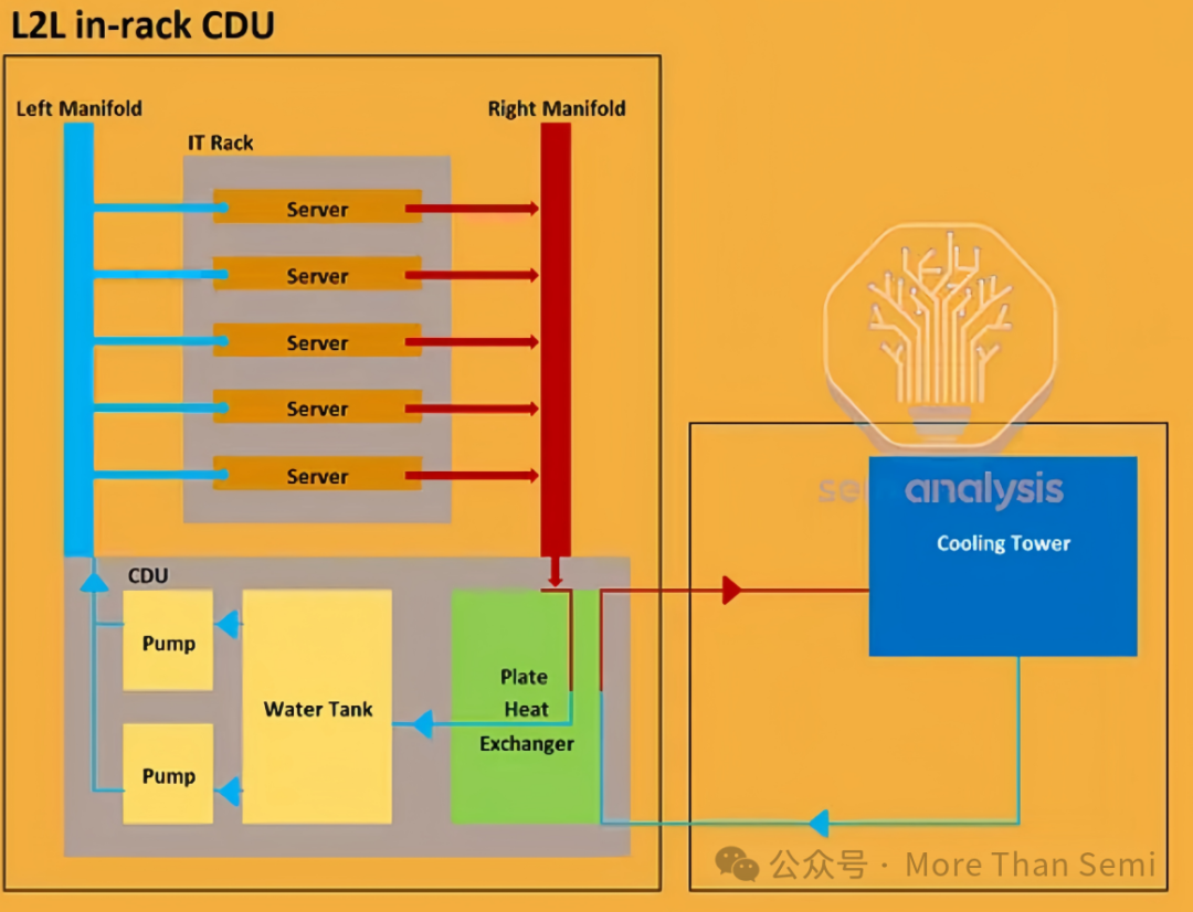 Pump(泵):用于為冷卻液體的循環(huán)提供動力,推動液體在系統(tǒng)內(nèi)流動。 Water Tank(水箱):儲存冷卻液體,保證系統(tǒng)有足夠的液體進(jìn)行循環(huán)冷卻。 Plate Heat Exchanger(板式換熱器):用于將吸收了服務(wù)器熱量的冷卻液體與其他冷卻介質(zhì)進(jìn)行熱量交換,使冷卻液體降溫,以便再次循環(huán)使用。
