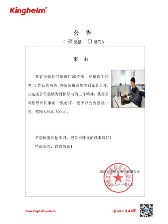 2026年02月02日到2026年02月06日,金航標(www.kinghelm.net)/薩科微(www.slkoric.com)"每周之星"經過同事們評比,這周"每周之星" 是金航標業務員李華蘭,在最近工作中,認真對接交叉公司資源,出單頻繁,業績穩中有升,以完成公司業績為目標導向的工作精神,獲得公司領導和同事的一致好評,現予以公告嘉獎一次,獎勵人民幣300。