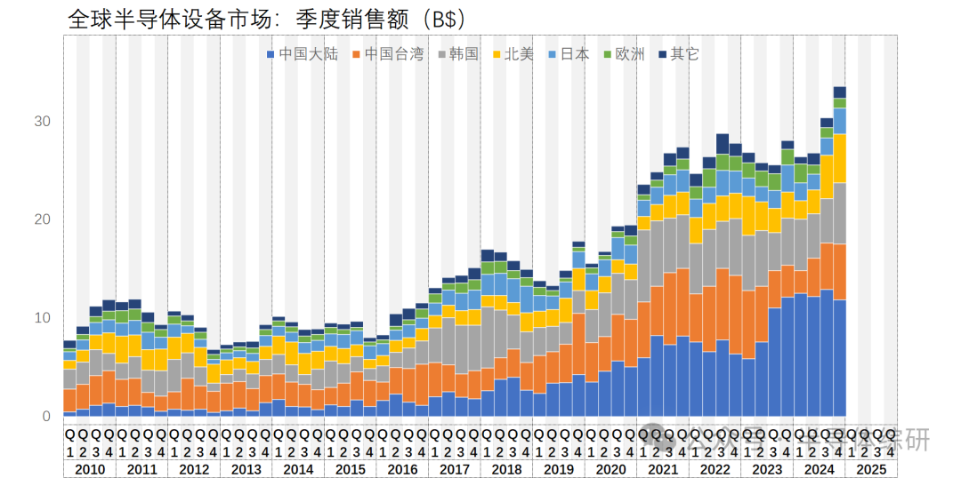 最近,SEMI公布了2024年全球半導體設備市場數據:1171億美金,較2023年增加了10.2% 很明顯,2024年全球半導體設備最大的市場是中國大陸。不過隨著建廠周期的變化遷移,2025年市場會暫時向中國臺灣和韓國遷移 我也把把全球主要的10家半導體設備供應商的財務數據整理好了,供大家參考一下 特別說明: 1. 本數據僅僅統計各家公司的半導體領域相關設備的營收(設備本體+相關服務收入),不包含面板、光伏、SMT等領域收入 2. 部分數據包含