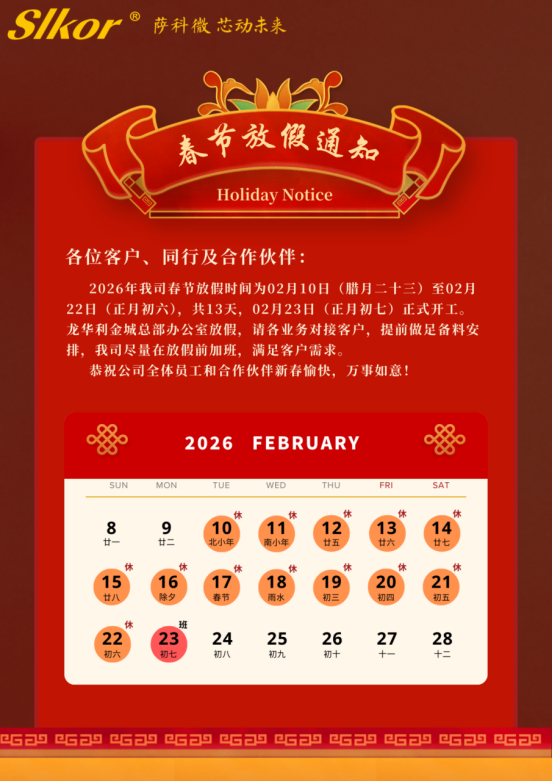 金航標和薩科微2026年春節放假時間:2月10日至2月22日(共13天)